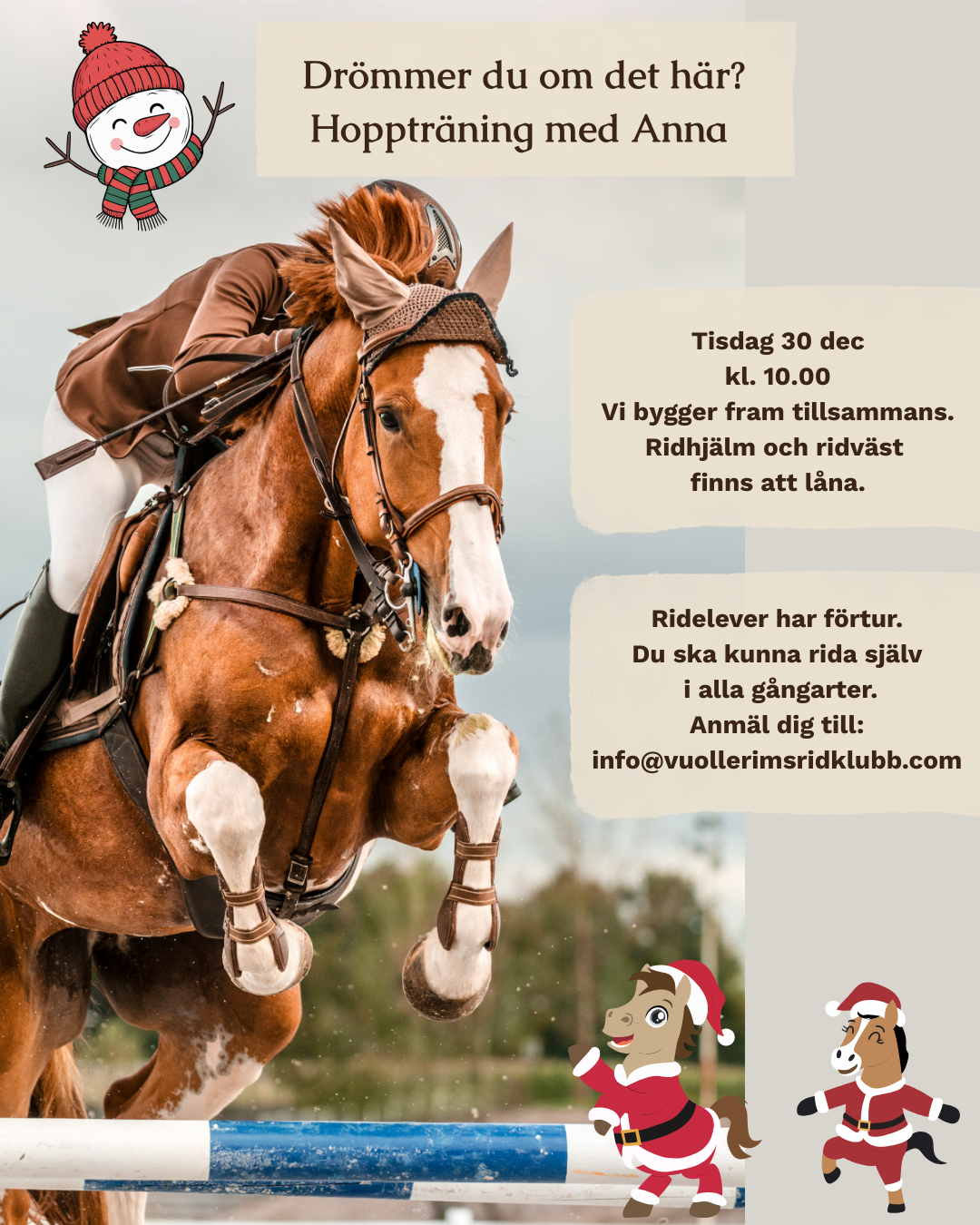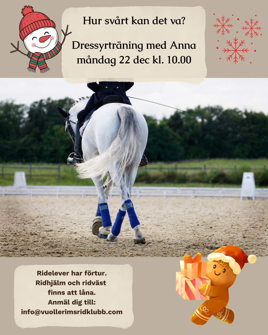19 december tar hästar och instruktörer julledigt från ordinarie lektionsverksamhet men det finns massor av andra saker du kan delta på om du vill - vi ses kanske i stallet! Gnägg :)