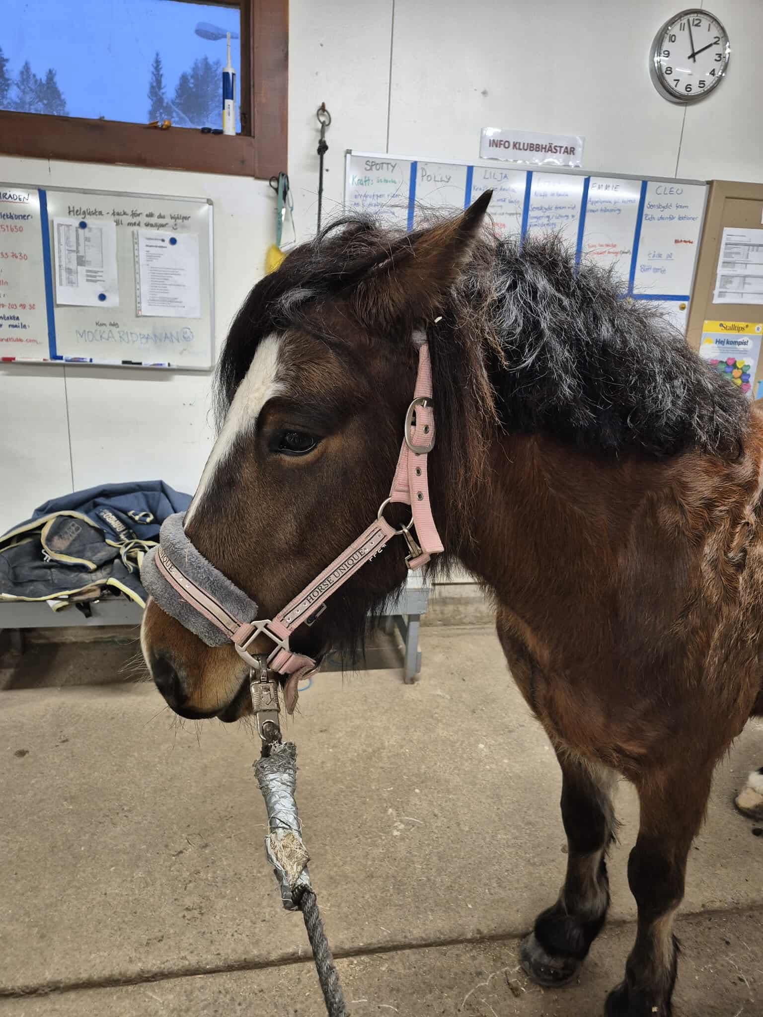 Polly är ett brunt sto, född 2017, lugn och trevlig att både rida och hantera. Hon kan det mesta och har tävlat i dressyr (LA) och hoppning (80 cm).
